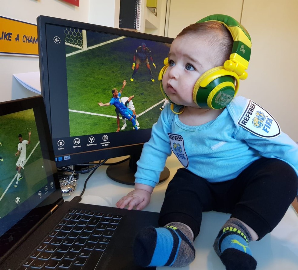 Théo analisando imagens do jogo através do árbitro de vídeo como se fosse o juiz (Foto: Arquivo pessoal)